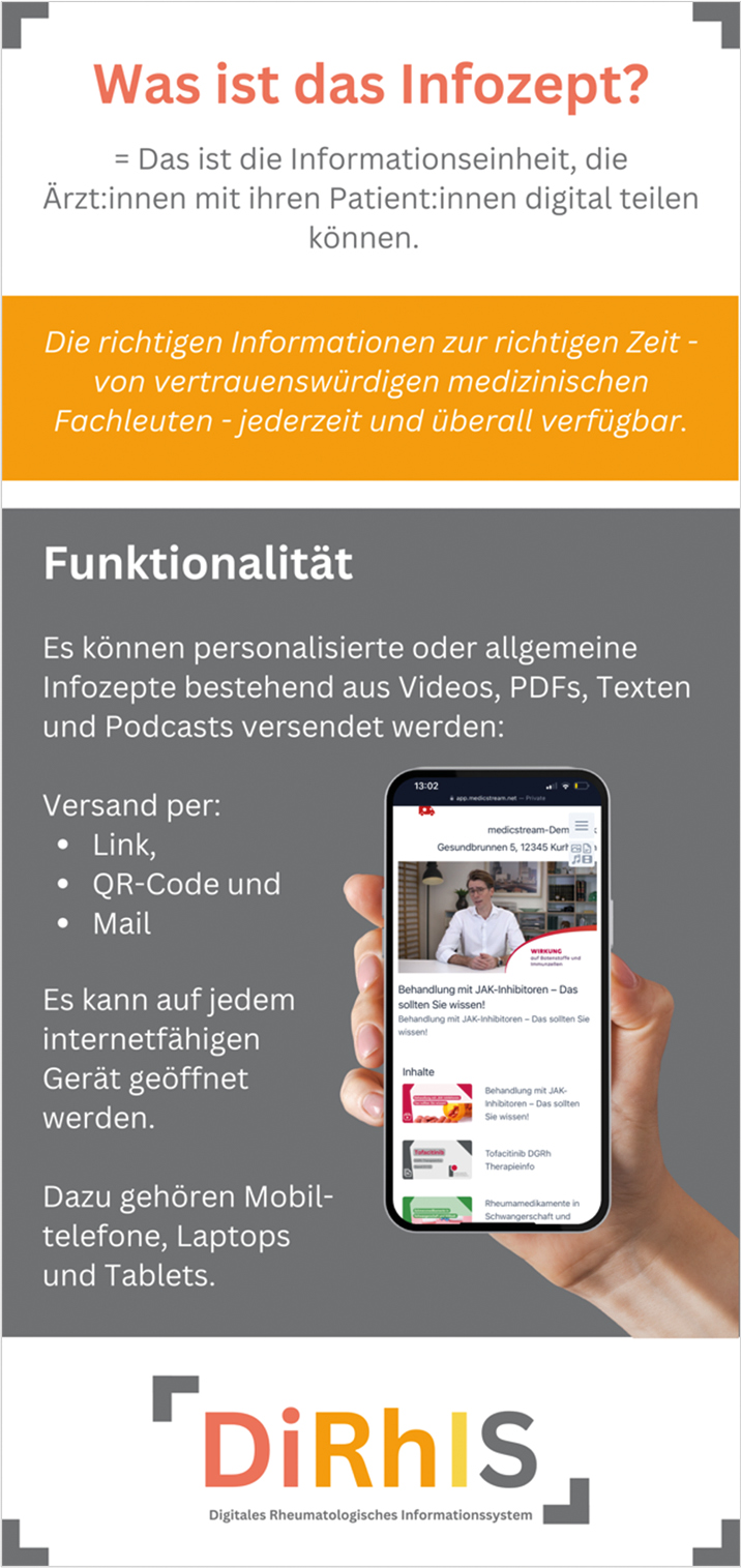 Die Inhalte werden von einem achtköpfigen Prüfgremium validiert und ermöglichen einen aufwandsarmen digitalen Versand. Dafür kann aus über 120 versorgungsrelevanten Themen zu den Indikationen RA, axSpA, PsA und SLE gewählt werden. Indem die vorhandenen Information patientenindividuell und digital zusammengestellt werden, können Betroffene die Inhalte ortsunabhängig und beliebig oft abrufen. Zusätzlich wurde die Arztversion der Therapieinformationsbögen der DGRh in das System integriert. Dies ermöglicht eine bessere Einbindung von Zuweisern in den Informationsprozess.