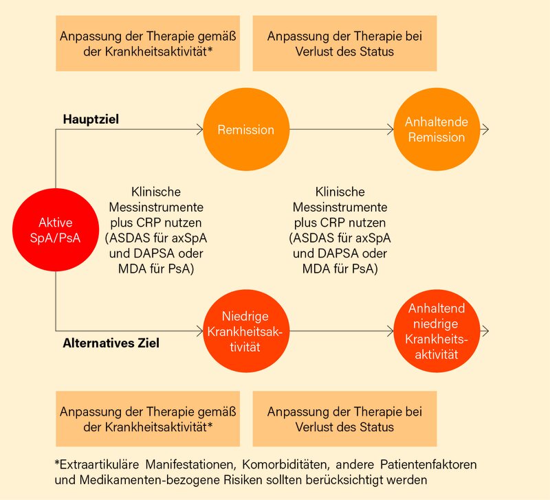 1. Das Behandlungsziel sollte eine klinische Remission/inaktive Erkrankung von sowohl muskuloskelettalen (Arthritis, Daktylitis, Enthesitis, axiale Erkrankung) als auch extraartikulären Manifestationen sein. 2. Das Behandlungsziel sollte individuell auf Basis der aktuellen klinischen Manifestation festegelegt werden, die Behandlungsmodalität sollte bei der Definition der zum Erreichen benötigten Zeit mitberücksichtigt werden. 3. Eine klinische Remission/inaktive Erkrankung ist definiert als Absenz des Nachweises von signifikanter Krankheitsaktivität (klinisch/Labor). 4. Eine niedrige/minimale Krankheitsaktivität kann ein alternatives Behandlungsziel sein. 5. Die Krankheitsaktivität sollte auf Basis der klinischen Zeichen und Symptome sowie der Akut-Phase-Reaktanten bestimmt werden. 6. Validierte Messinstrumente der muskuloskelettalen Krankheitsaktivität und die Bestimmung kutaner und/oder anderer relevanter extra-artikulärer Manifestationen sollten in der klinischen Praxis genutzt werden, um das Behandlungsziel zu definieren und die Therapieentscheidung zu leiten; die Häufigkeit von deren Messung hängt vom Niveau der Krankheitsaktivität ab.