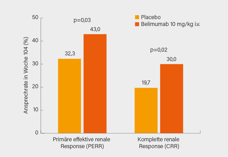 Primärer Studienendpunkt war eine primäre effektive renale Response (PERR) in Woche 104, definiert als eGFR ≥60 ml/min/1,73 m2 oder von ≥80 % des Ausgangswertes vor dem Schub und ein uPCR ≤0,7 und kein Therapieversagen. Sekundäre hierarchische Endpunkte waren ein komplettes renales Ansprechen (CRR) in Woche 104, definiert als eGFR ≥90 % des Ausgangswertes vor dem Schub oder im Normbereich und uPCR <0,5 und kein Therapieversagen, eine PERR in Woche 52, die Zeit bis zum Tod oder einem renalen Ereignis, letzteres war definiert als terminale Niereninsuffizienz, Verdopplung des Serum-Kreatinin, renale Verschlechterung (Anstieg der Proteinurie bzw. eingeschränkte Nierenfunktion) oder renal-bedingtes Therapieversagens. Zuletzt wurde noch eine ordinale renale Response (ORR) in Woche 104 erfasst, definiert als ein komplettes, partielles oder kein Ansprechen (partielle ORR = keine eGFR-Verschlechterung >10 % oder normale eGFR, ≥50 % Abnahme des uPCR oder uPCR <3,0, kein Therapieversagen, keine komplette renale Remission). Im primären Endpunkt PERR zeigte sich über zwei Jahre ein signifikanter Vorteil von Belimumab (43,0 vs. 32,3 %, Odds ratio, OR 1,55, 95% KI 1,0-2,3; p=0,0311). Gleiches gilt für die sekundären Endpunkte CRR in Woche 104 (30,0 vs. 19,7 %, OR 1,74; p=0,0167), PERR in Woche 52 (46,6 vs. 35,4 %, OR 1,59; p=0,0245), Zeit bis zum Tod oder einem renalen Ereignis (15,7 vs. 28,3 %, Hazard ratio, HR 0,51; p=0,0014) und ORR in Woche 104 (p=0,01) (Abb.). Einen SLEDAI-2K-Score <4 erreichten 27,8 vs. 18,4 % der Teilnehmer unter Belimumab plus SoC gegenüber der alleinigen SoC (OR 1,76; p=0,0164). Es bestätigte sich das gute Sicherheitsprofil von Belimumab, alle und schwere unerwünschte Ereignisse waren in beiden Gruppen auf ähnlichem Niveau, auch bezüglich Depression oder Suizidalität gab es keine Sicherheitssignale.