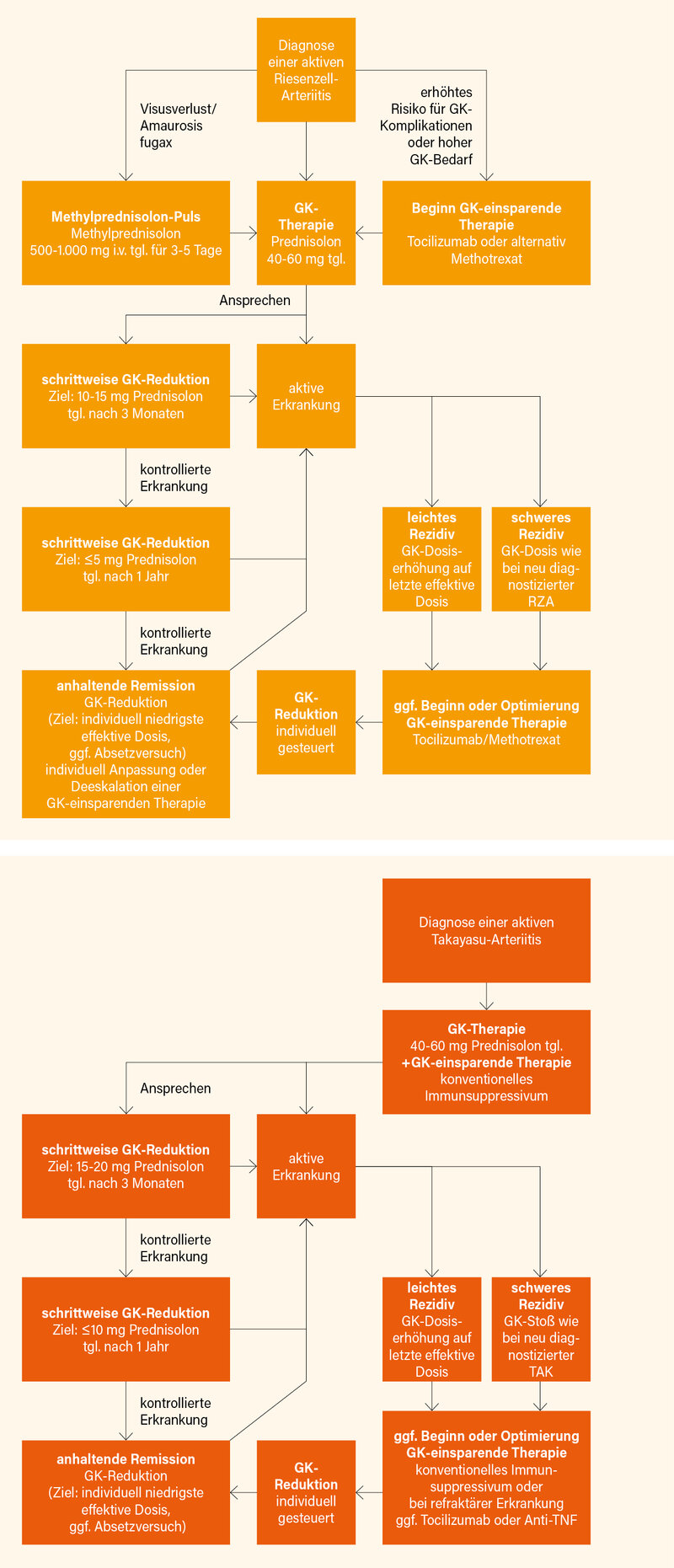 4a) Bei bestimmten RZA-Patienten (insbesondere refraktäre oder rezidivierende Erkrankung, Vorhandensein von oder erhöhtes Risiko für GK-assoziierte Folgeschäden) sollte nach individueller Abwägung eine GK-einsparende Therapie mit Tocilizumab durchgeführt werden. Methotrexat (MTX) kann als Alternative eingesetzt werden. 4b) Unter Tocilizumab sollte bei RZA eine schnellere Reduktion der GK-Dosis verglichen mit der GK-Monotherapie erfolgen. Auch unter MTX sollte bei RZA eine raschere GK-Dosisreduktion angestrebt werden. 4c) Bei anhaltender Remission der RZA sollte eine Deeskalation oder Beendigung der GK-einsparenden Therapie erwogen werden. 5) TA-Patienten sollten zusätzlich zu GK mit konventionellen Immunsuppressiva behandelt werden. Bei refraktären, rezidivierenden oder GK-abhängigen Verläufen sollten TNFa-Inhibitoren oder Tocilizumab erwogen werden. 6) Bei einem schweren GGV-Rezidiv soll erneut eine GK-Therapie begonnen bzw. bestehende GK-Therapie intensiviert werden (Initialdosierung wie bei neu diagnostizierter GGV). Bei einem leichten Rezidiv sollte die GK-Dosis auf mindestens die letzte wirksame Dosis erhöht werden. Eine GK-sparende Therapie sollte bei rezidivierender Erkrankung begonnen oder angepasst werden.
