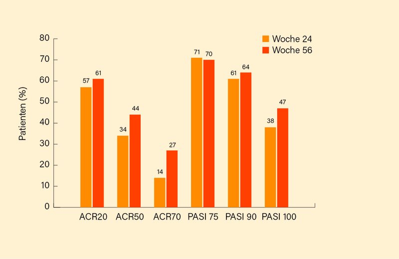 In Woche 24 wechselten 29 der ursprünglich 49 Placebo-Patienten auf Guselkumab, auf dem IL-23-Hemmer blieben 86 der zu Beginn 100 Teilnehmer. Ab Woche 24 kam es in Woche 44 und 56 zu einer deutlichen Verbesserung der ACR- und PASI-Response bei den von Placebo auf Guselkumab gewechselten Patienten: So betrug z. B. das ACR20/50/70- Ansprechen in Woche 56 81,5, 66,7 und 28,6 %, das PASI75/90/100-Ansprechen 81,5, 74,1 und 55,6 %. Im Fall der durchgehend mit Guselkumab behandelten Patienten wurden die in Woche 24 erzielten Ergebnisse aufrechterhalten oder noch verbessert auf (Woche 56) für das ACR20/50/70-Kriterium 73,5, 53,0 und 32,5 % und für das PASI75/90/100-Ansprechen 85,4, 78,0 und 57,3 % (Abb. 1). Der Anteil von Patienten mit MDA stieg von 26,7 (Woche 24) auf 34,5 % (Woche 44) an, der Anteil Patienten mit nicht völlig zurückgedrängter Enthesitis bzw. Daktylitis fiel (von Woche 24 bis 56) von 38,8 auf 29,2 % bzw. von 40,0 auf 25,5 % ab. Generell war nur eine geringe Therapiedifferenz zwischen Woche 44 (letzte Guselkumab-Applikation) und dem „off drug“-Follow-up in Woche 56 erkennbar. Die Verträglichkeit war auch über 56 Wochen gut (nur sechs schwere UE) mit keinen neuen Sicherheitssignalen.