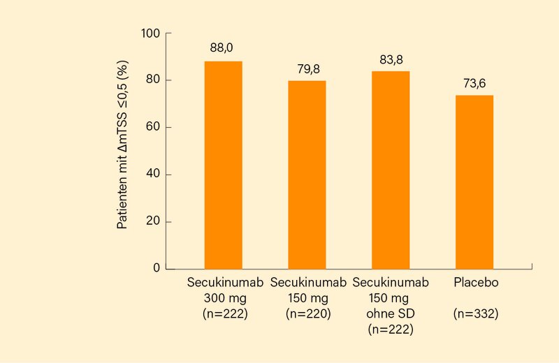 Der primäre Endpunkt des ACR20-Ansprechens in Woche 16 wurde mit allen Secukinumab-Dosierungen (ohne relevanten Unterschieden zwischen diesen) signifikant versus Placebo erreicht, gleiches galt vor allem auch für die Hemmung der Röntgenprogression im mTSS in Woche 24. Ein größerer Anteil von Patienten zeigte keine Röntgenprogression (ΔmTSS ≤0,5) unter Secukinumab gegenüber Placebo: 88 % (300 mg), 79 % (150 mg), 83 % (150 mg ohne SD) versus 73 % (Placebo) (Abb. 2). Auch alle weiteren Endpunkte wiesen signifikante Vorteile von Secukinumab versus Placebo in Woche 16 aus mit Ausnahme einer völligen Resolution von Enthesitis und Daktylitis unter Secukinumab 150 mg ohne Sättigungsdosis. Generell zeigten Patienten der 300- und 150 mg-Gruppe ein rascheres Ansprechen gegenüber jenen mit 150 mg ohne vorherige Applikation einer Sättigungsdosis.